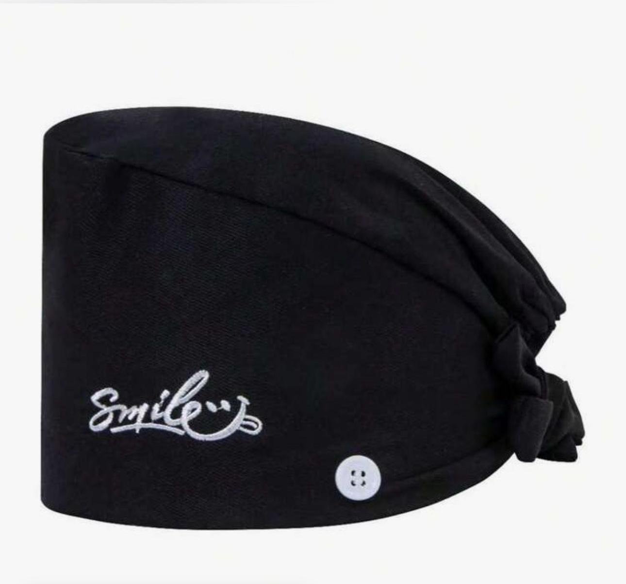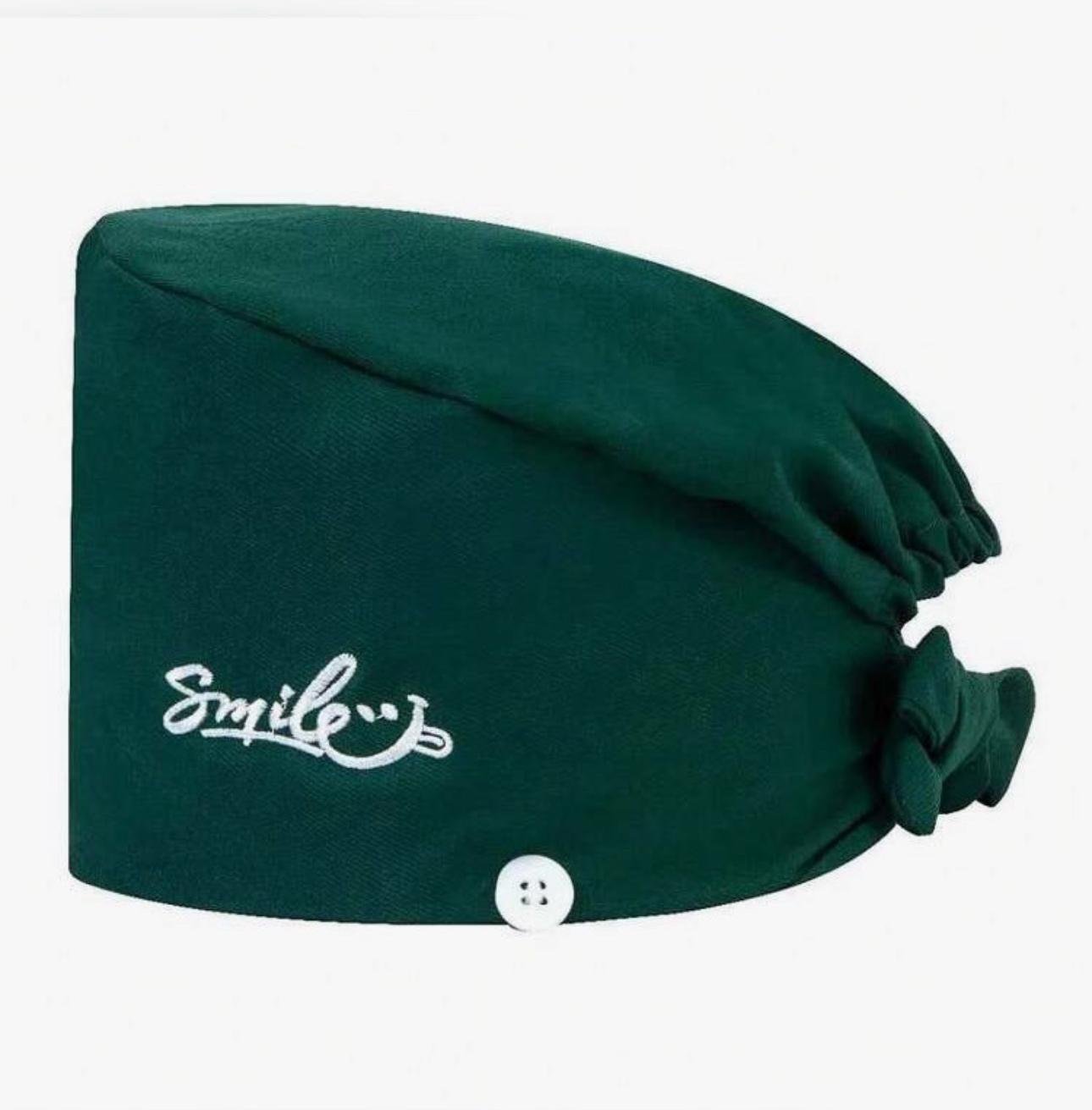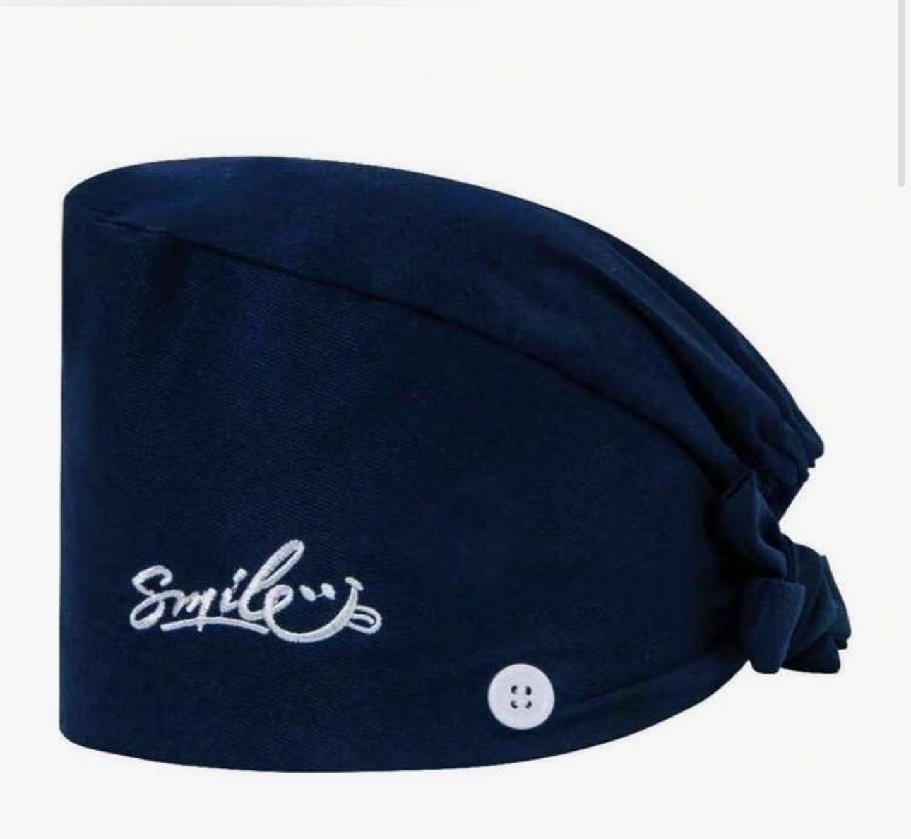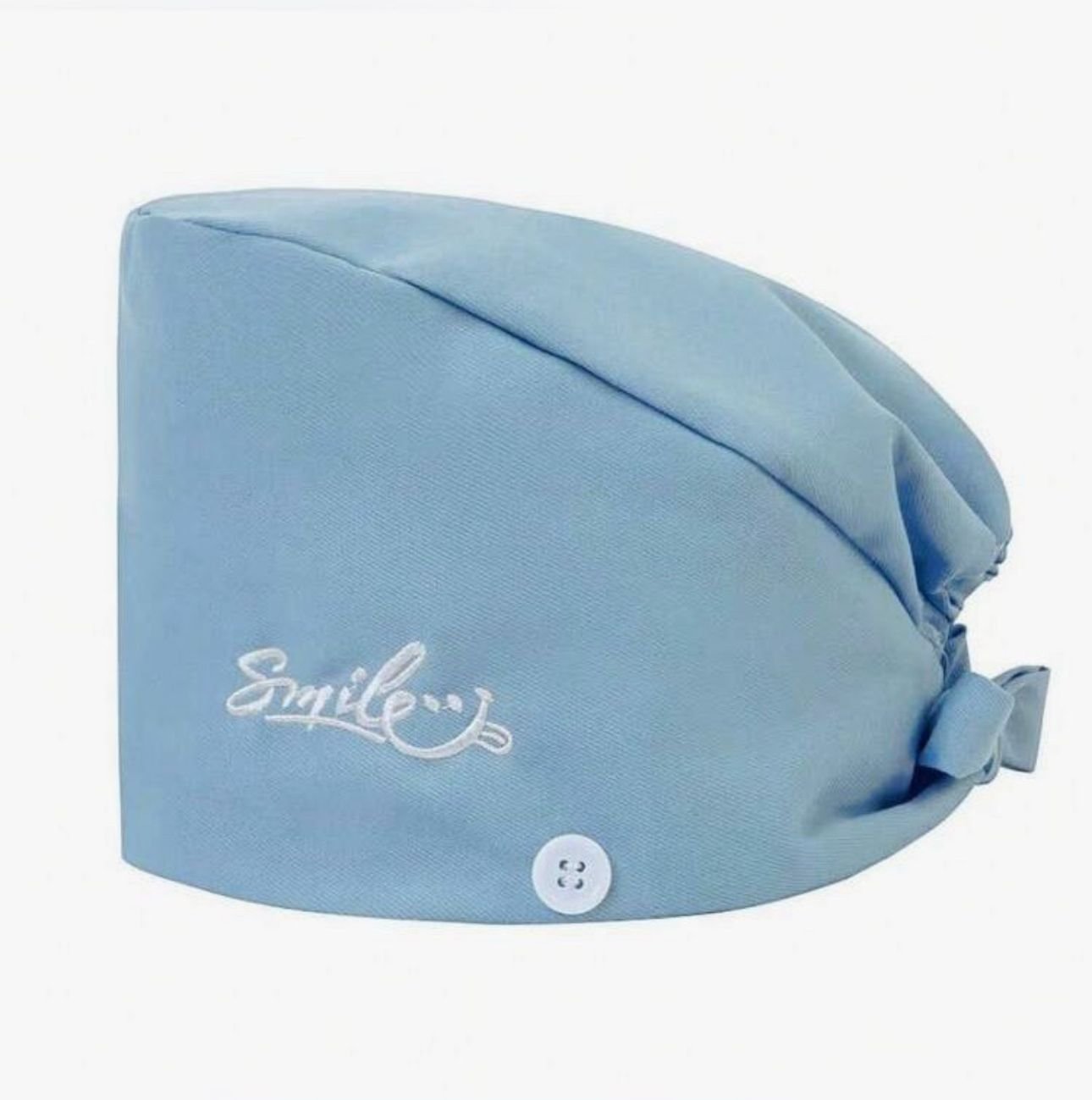 Women’s medical cap featuring an embroidered smile letter pattern. It is antibacterial, dust-proof, and splash-proof.